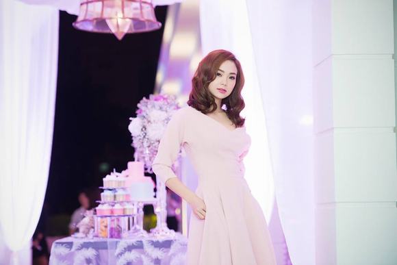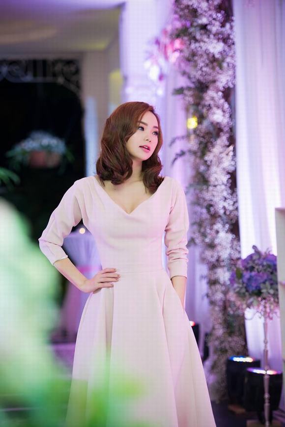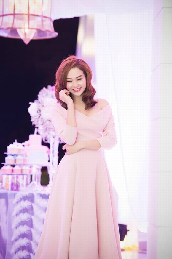 Minh Hằng chọn chiếc váy hồng có phần cổ xẻ rộng tạo sự gợi cảm cho người đẹp